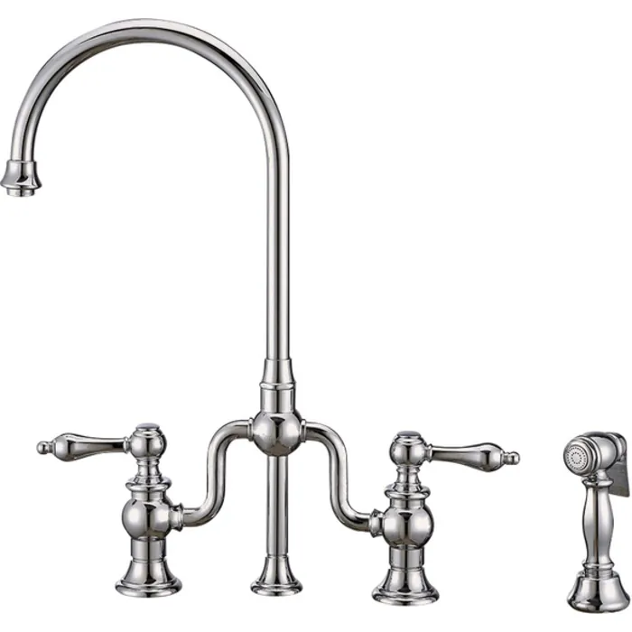 Whitehaus Twisthaus Plus Bridge Faucet With Gooseneck Swivel Spout, Lever Handles And Solid Brass Side Spray In Polished Chrome WHTTSLV3-9773-NT-C