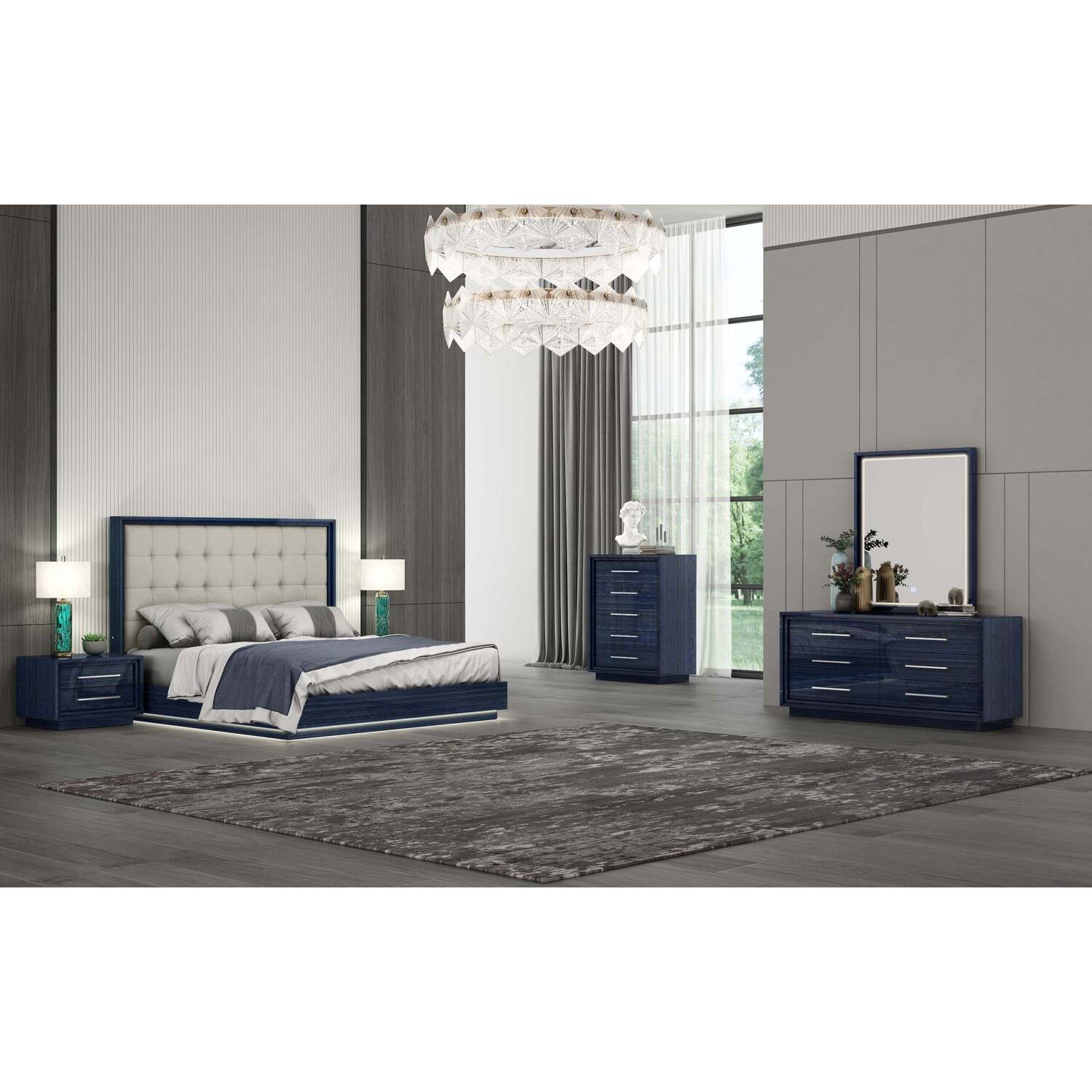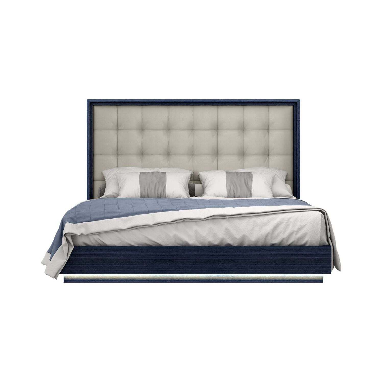 WhiteLine Alexander Bed King, High Gloss Saphire Blue Lacquer ILP-8273-8HG, Upholstered Headboard in Light Grey Faux Leather ILP-A23-17 ,Base with LED Light., 0696576756801, BK1937-BLU/LGRY