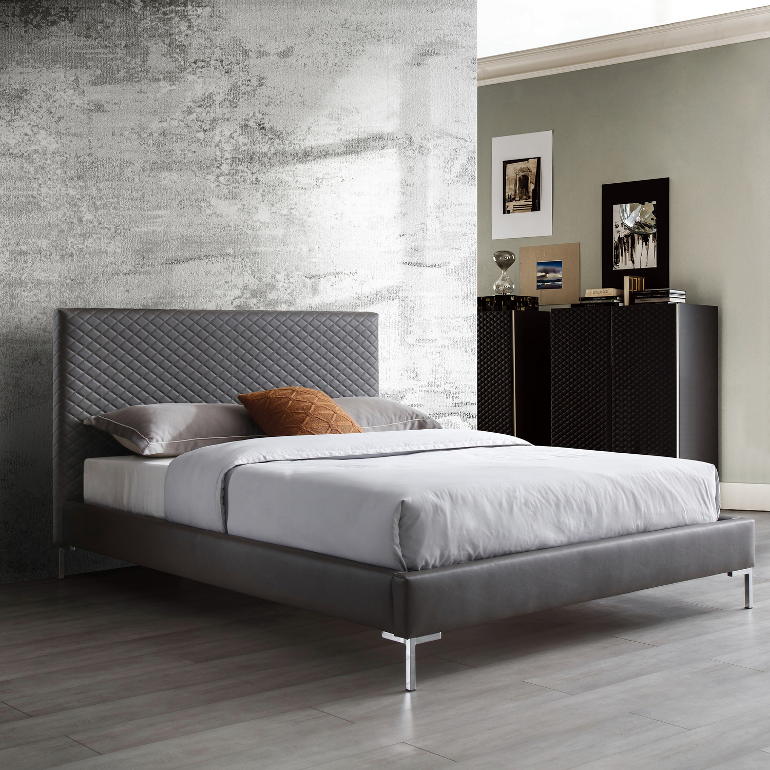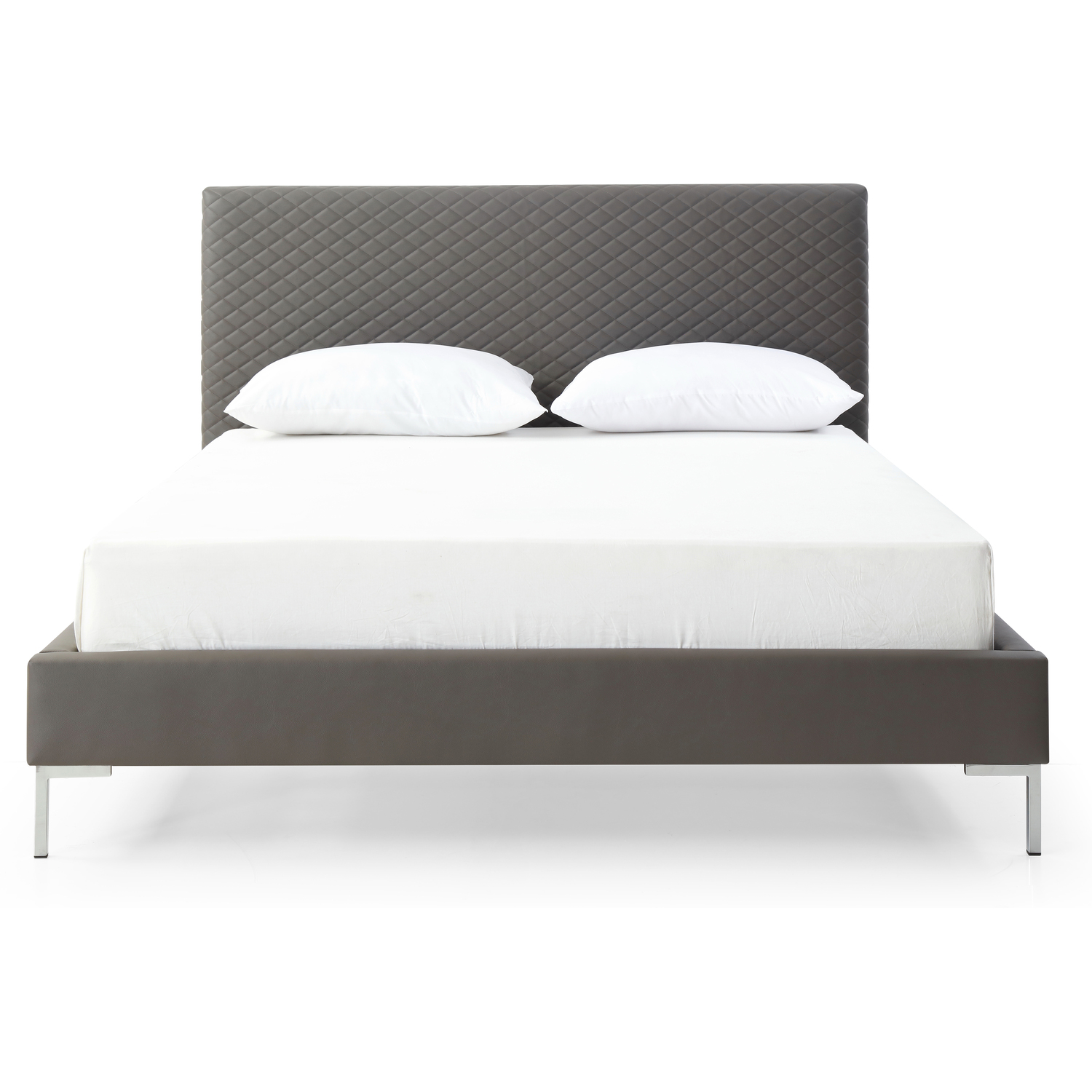 Liz Queen Bed , Fully Upholstered Dark Gray faux leather, Chrome Legs