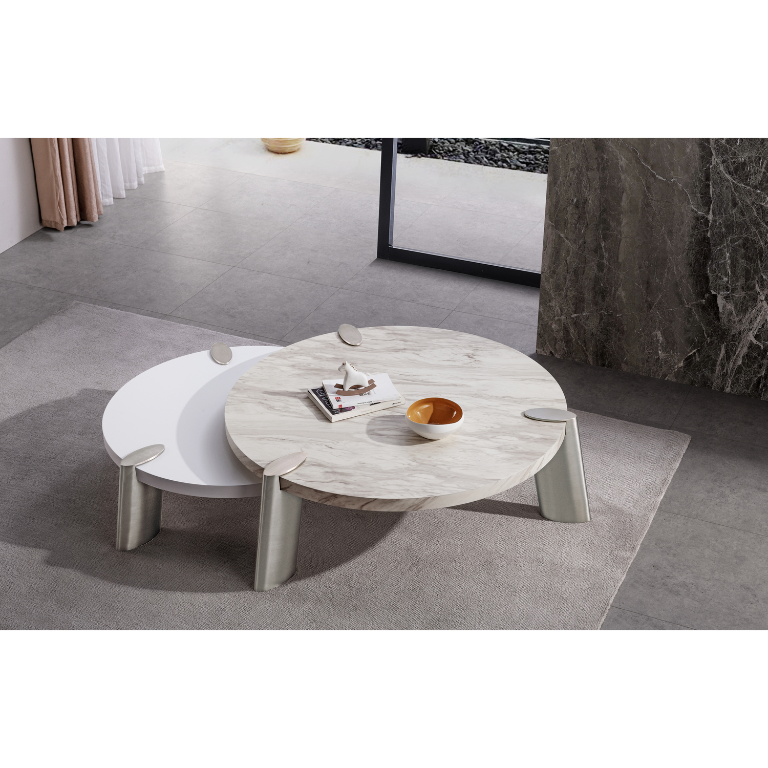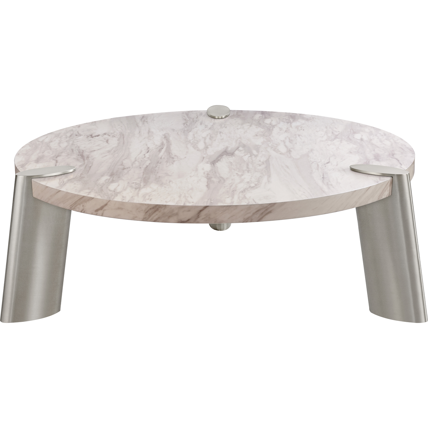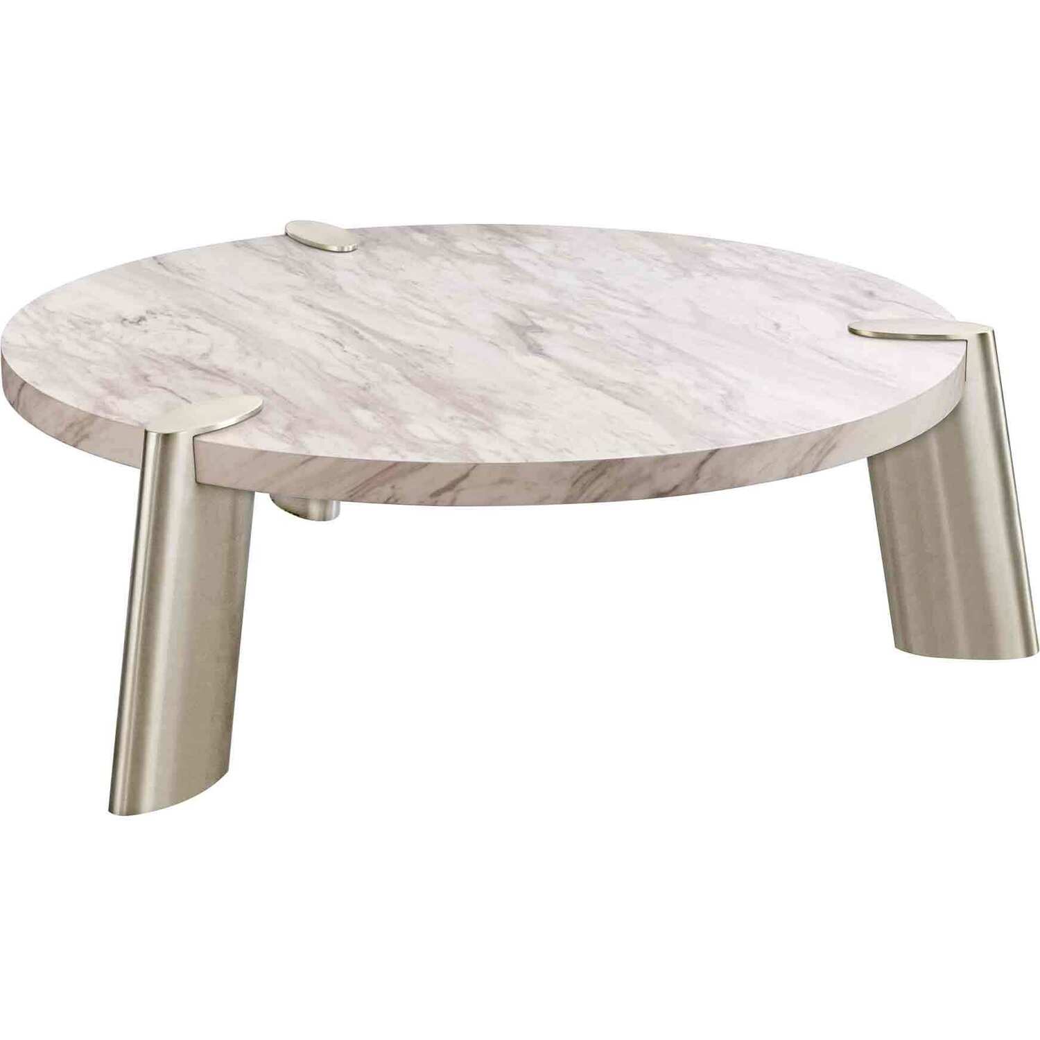 Mimeo Large round Coffee Table, White Marble Paper top, Legs brushed stainless steel.