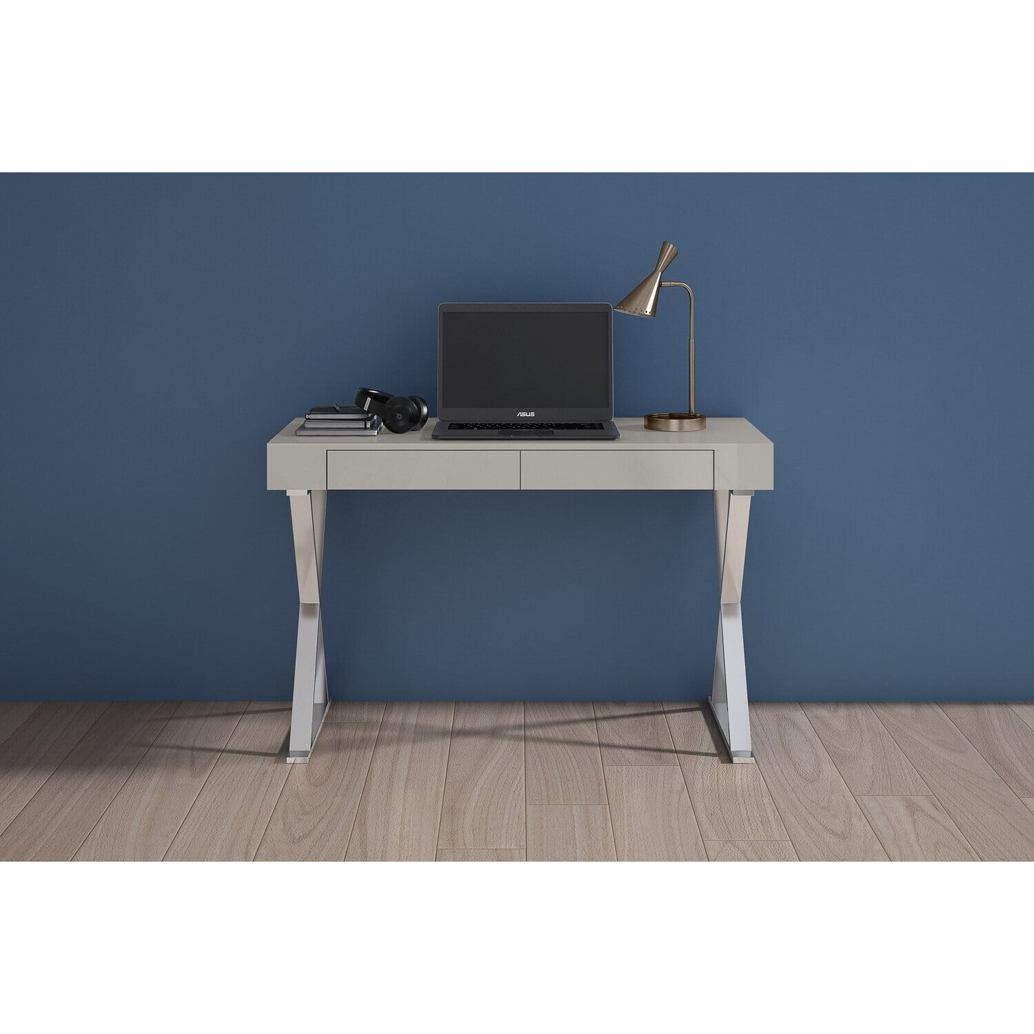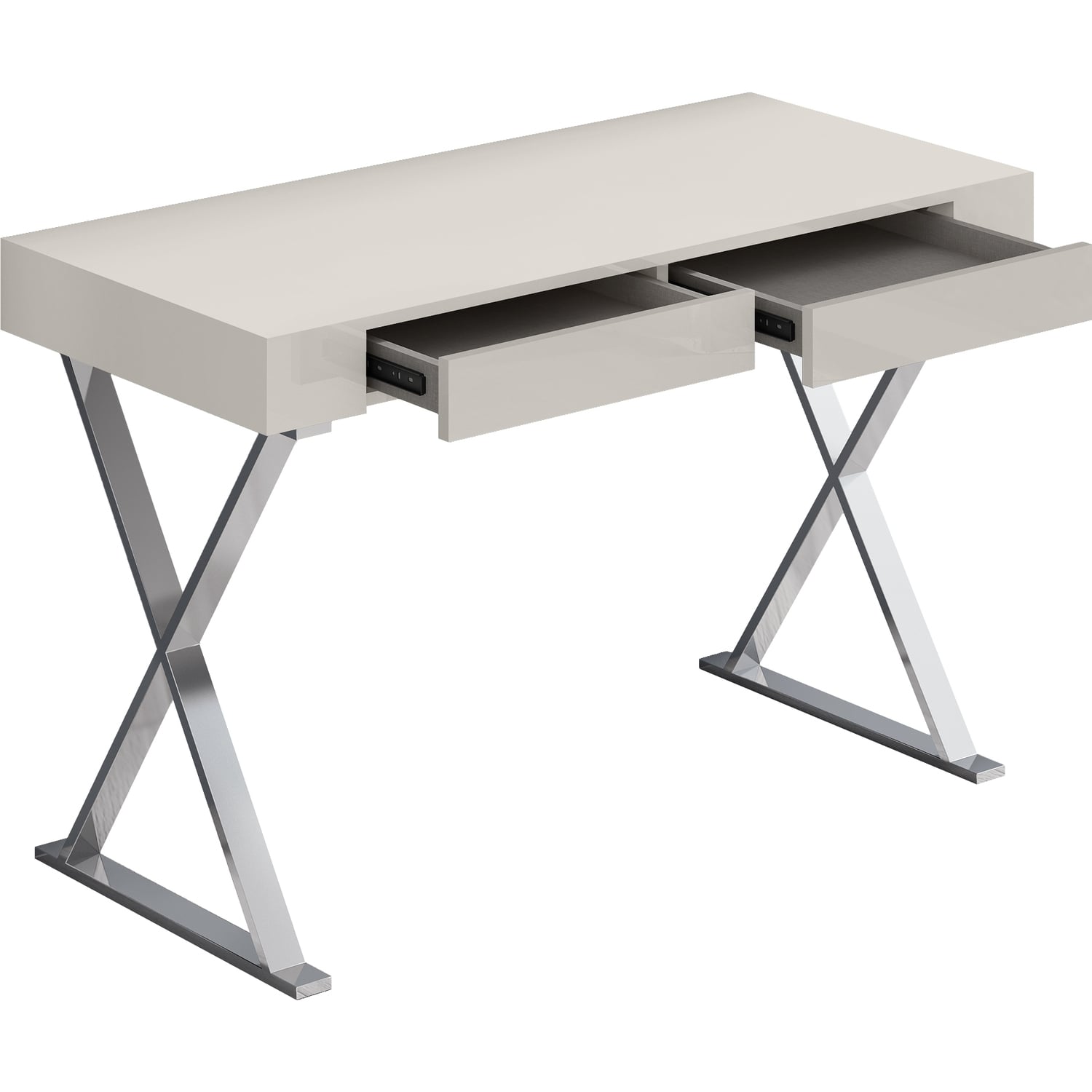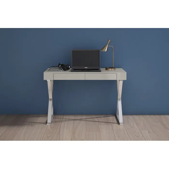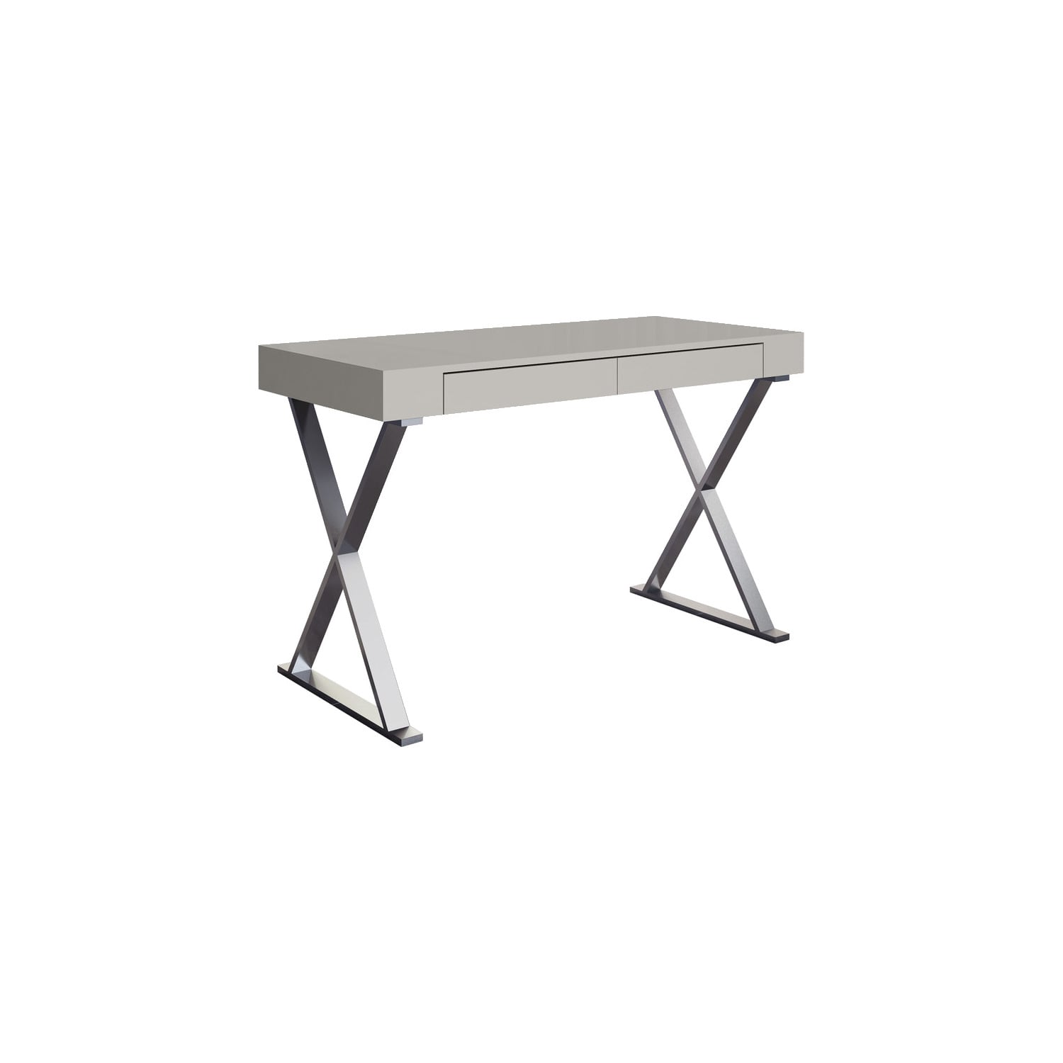 WhiteLine Elm Large Desk , High Gloss Light Grey Lacquer ILP-8890213 HG with Two Drawers, Polished Silver Stainless Steel Base., 0696576756542, DK1205L-LGRY