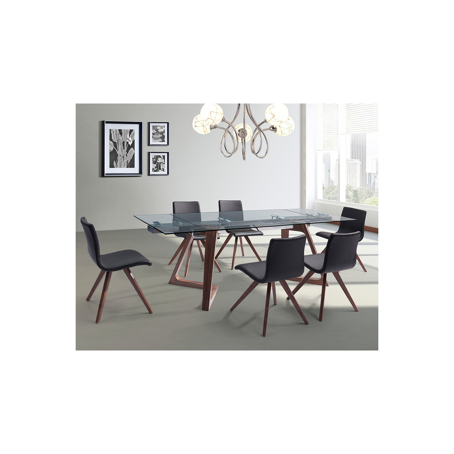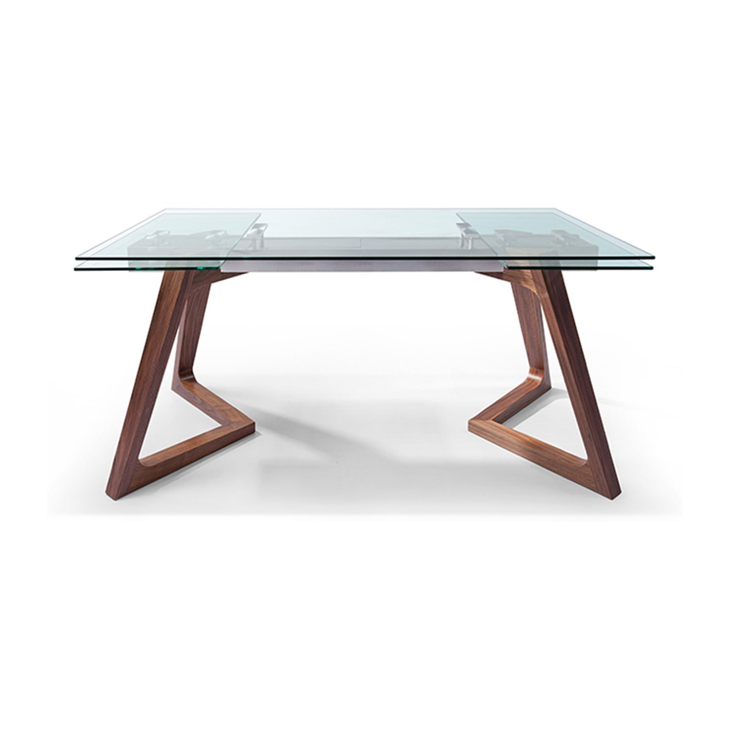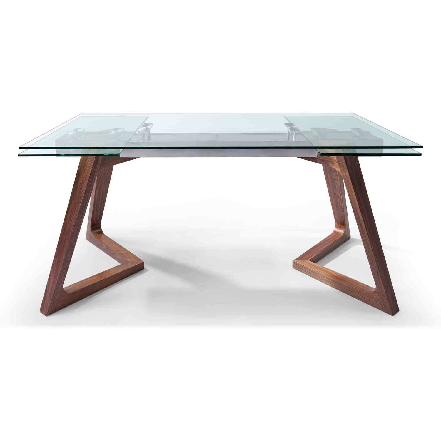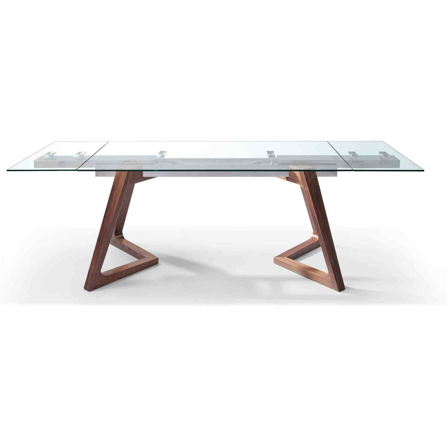 Delta Extendable Dining Table 10mm tempered clear glass top, stainless steel frame, poplar wood with walnut veneer base