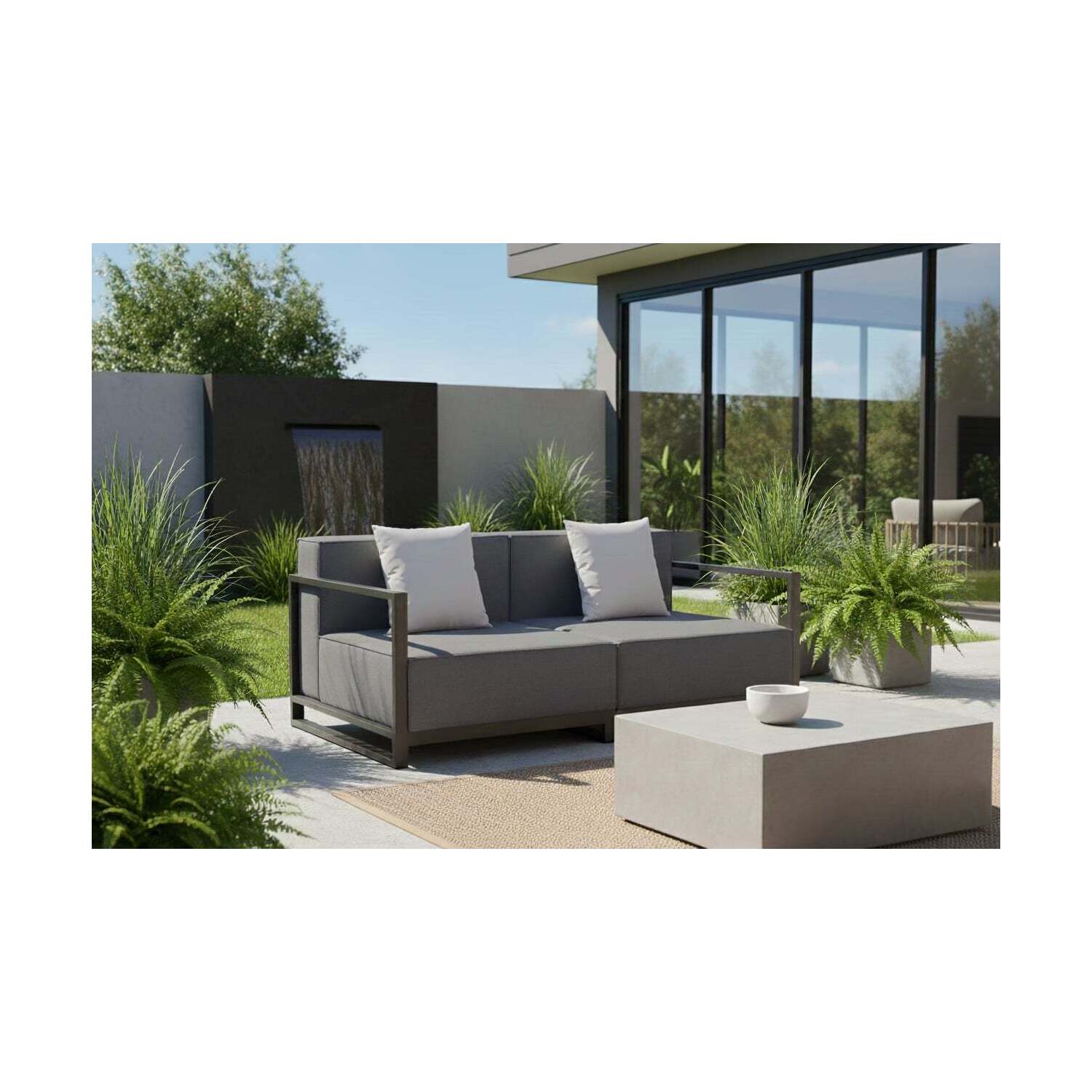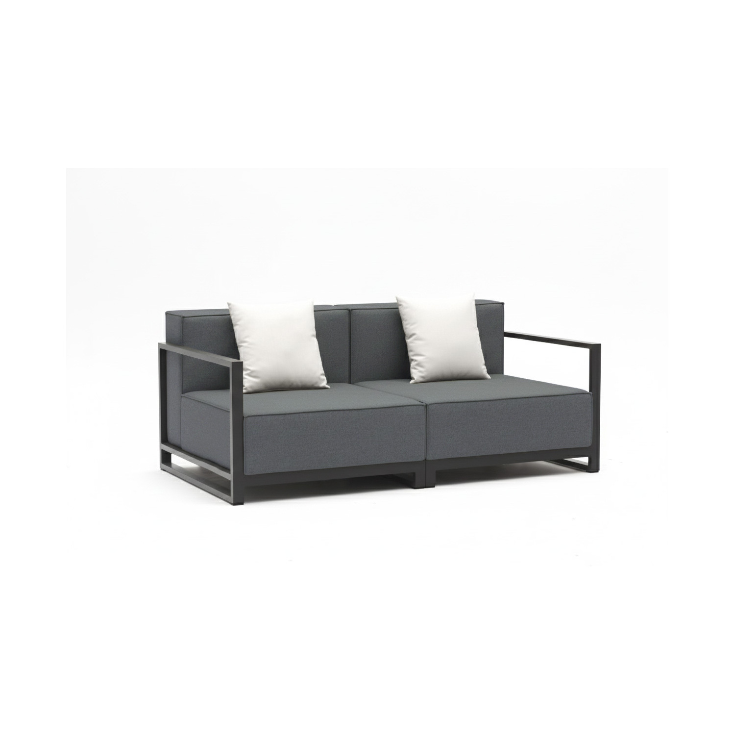 WhiteLine Sensation Indoor/Outdoor Love Seat, Armrest and Legs in Dark Grey Aluminum AUG-PT9970. Seat and Back Cushions in Dark Grey Fabric AUG-Couture No. 2, with a Decorative White Pillow AUG-15225031., 0696576751196, LS1701-GRY