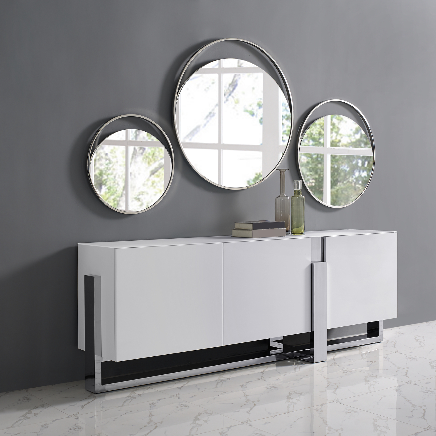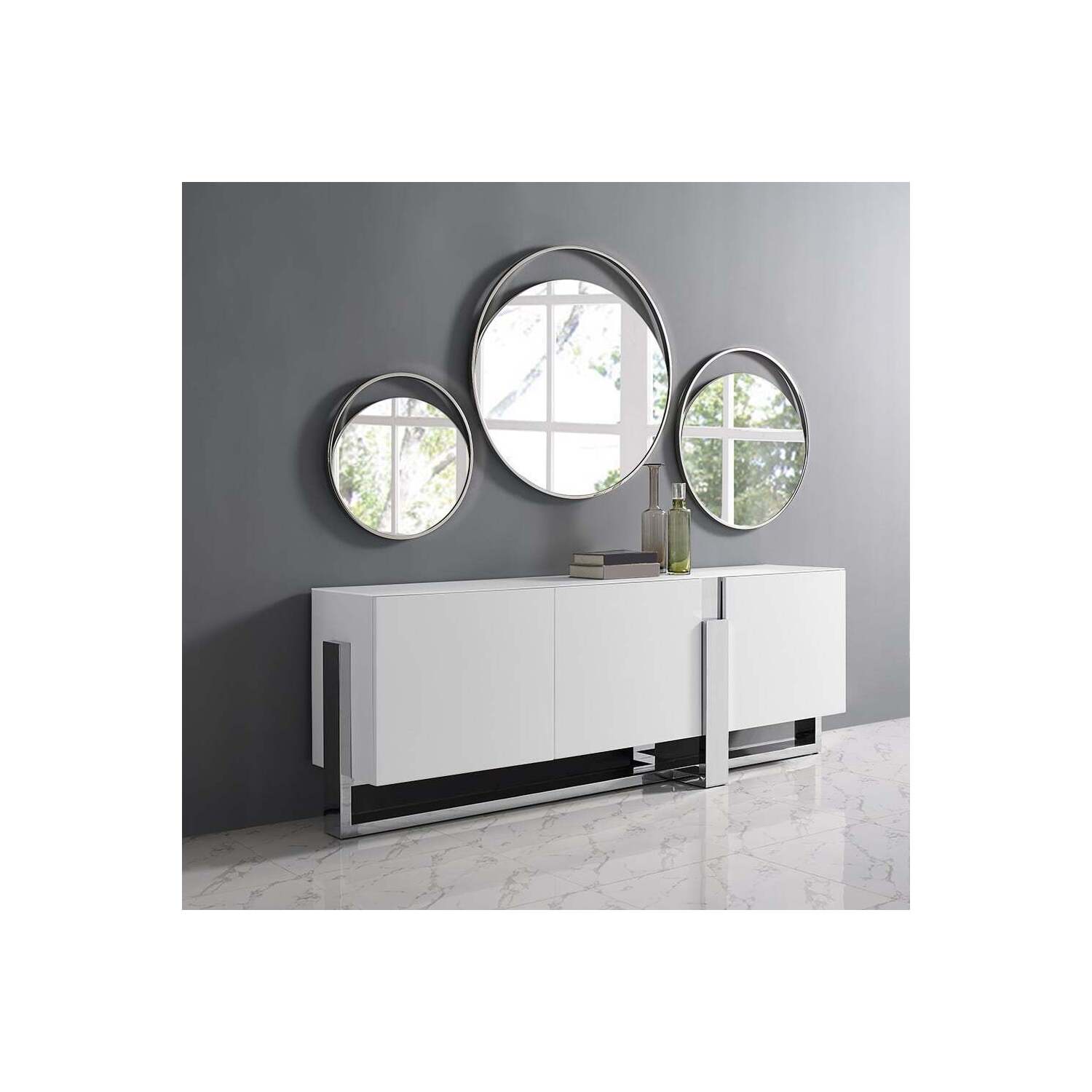 Blake Buffet 5mm Tempered Crystal Frosted Glass Top, Matte white, Polished Stainless Steel Base.