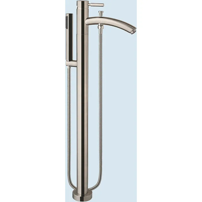 The Taron Floor-mounted bathtub faucet. Brushed chrome finish for endurance and beauty, solid brass core construction and a dripless German cartridge for years of trouble-free use. If you're looking for a new modern look in the bathroom, the Taron is the latest in updated European design.This modern tub faucet pairs well with modern freestanding tubs for an ultra clean and functional new look.Design details like a single handle for combined temperature and flow control, a subtlely curved spout designed for the best water flow, and an included handshower highlight this tub filler's stand out features.