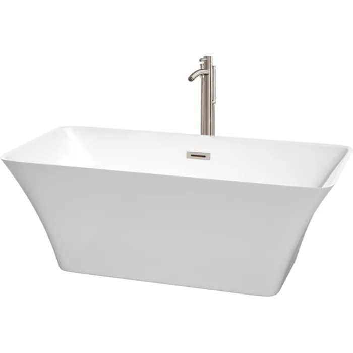 Wyndham Collection 59 Inch Freestanding Bathtub In White With Floor Mounted Faucet, Drain And Overflow Trim In Brushed Nickel WCBTK150459ATP11BN