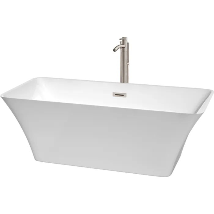 Wyndham Collection 67 Inch Freestanding Bathtub In White With Floor Mounted Faucet, Drain And Overflow Trim In Brushed Nickel WCBTK150467ATP11BN