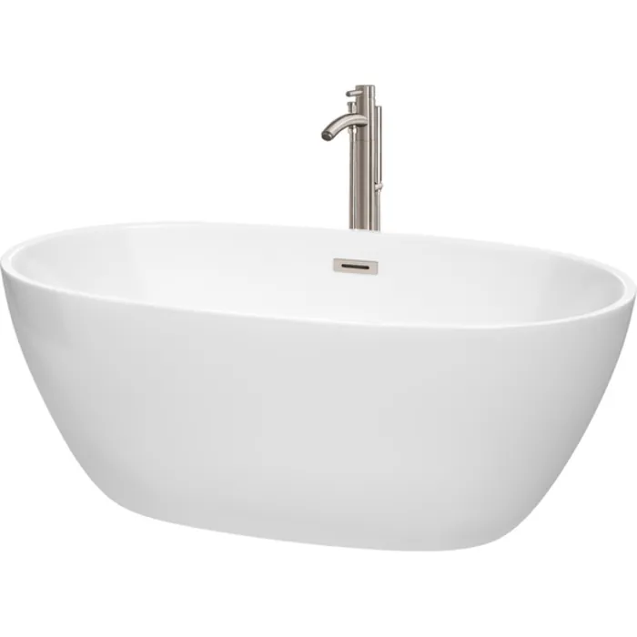 Wyndham Collection 59 Inch Freestanding Bathtub In White With Floor Mounted Faucet, Drain And Overflow Trim In Brushed Nickel WCBTK156159ATP11BN