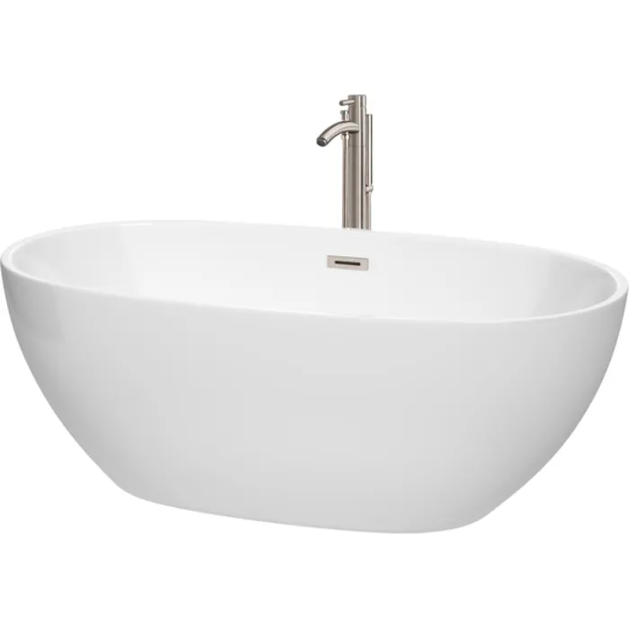 Wyndham Collection 63 Inch Freestanding Bathtub In White With Floor Mounted Faucet, Drain And Overflow Trim In Brushed Nickel WCBTK156163ATP11BN