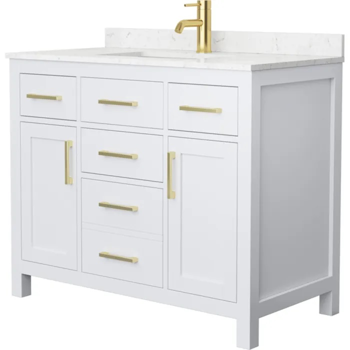 Beckett 42 Inch Single Bathroom Vanity in White, Carrara Cultured Marble Countertop, Undermount Square Sink, Brushed Gold Trim