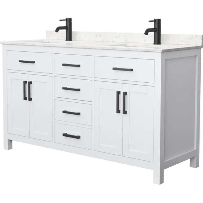 Beckett 60 Inch Double Bathroom Vanity in White, Carrara Cultured Marble Countertop, Undermount Square Sinks, Matte Black Trim