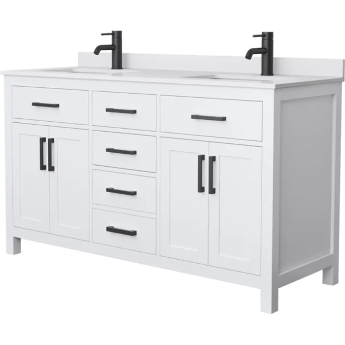 Beckett 60 Inch Double Bathroom Vanity in White, White Cultured Marble Countertop, Undermount Square Sinks, Matte Black Trim