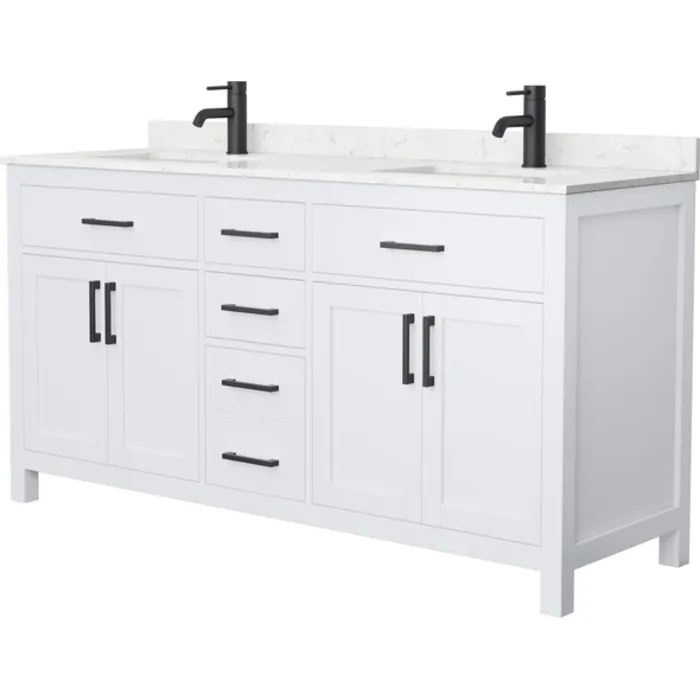 Beckett 66 Inch Double Bathroom Vanity in White, Carrara Cultured Marble Countertop, Undermount Square Sinks, Matte Black Trim