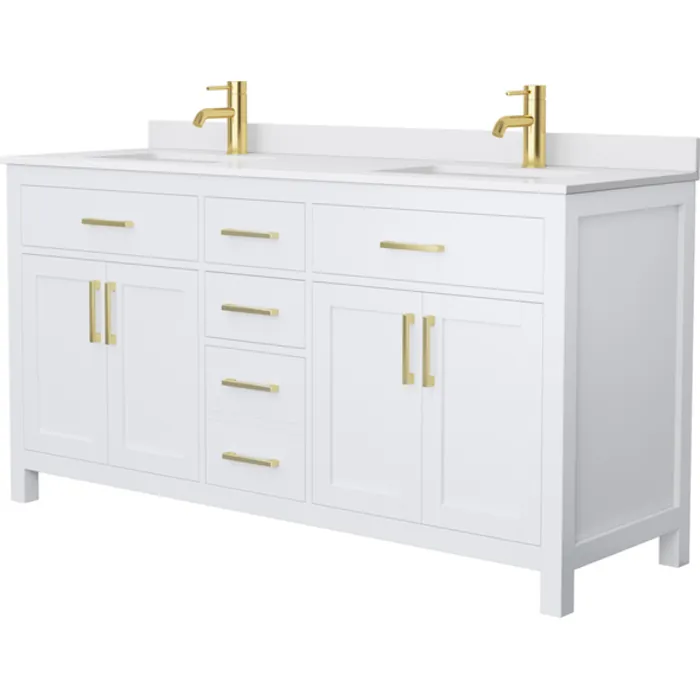 Beckett 66 Inch Double Bathroom Vanity in White, White Cultured Marble Countertop, Undermount Square Sinks, Brushed Gold Trim