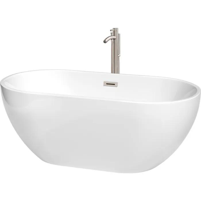 Brooklyn 60 Inch Freestanding Bathtub in White with Floor Mounted Faucet, Drain and Overflow Trim in Brushed Nickel