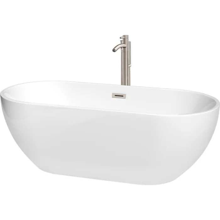 Brooklyn 67 Inch Freestanding Bathtub in White with Floor Mounted Faucet, Drain and Overflow Trim in Brushed Nickel