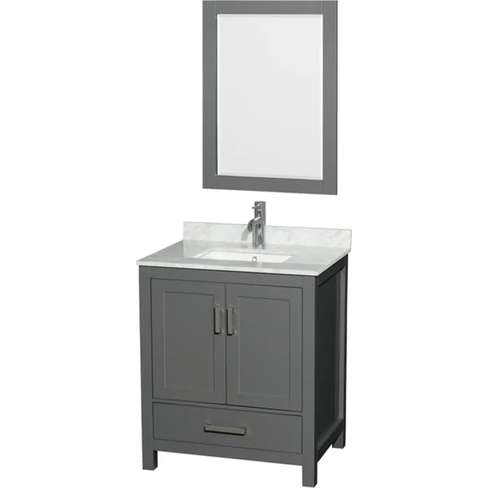 Wyndham Collection 30 Inch Single Bathroom Vanity In Dark Gray, White Carrara Marble Countertop, Undermount Square Sink, And 24 Inch Mirror WCS141430SKGCMUNSM24