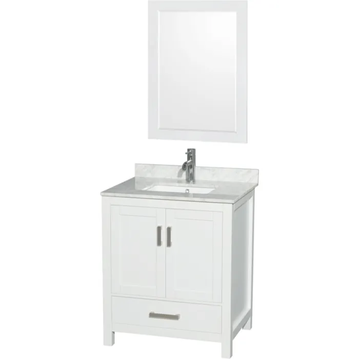 Wyndham Collection 30 Inch Single Bathroom Vanity In White, White Carrara Marble Countertop, Undermount Square Sink, And 24 Inch Mirror WCS141430SWHCMUNSM24