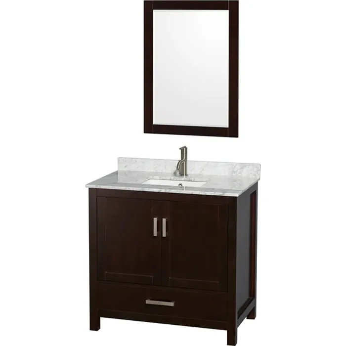 Wyndham Collection WCS141436SESCMUNSM24 36 In. Single Bathroom Vanity In Espresso, White Carrera Marble Countertop, Undermount Square Sink, And 24 In. Mirror