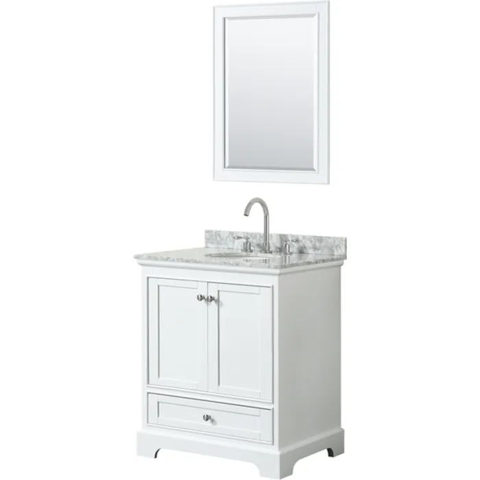 Wyndham Collection 30 Inch Single Bathroom Vanity In White, White Carrara Marble Countertop, Undermount Oval Sink, And 24 Inch Mirror WCS202030SWHCMUNOM24