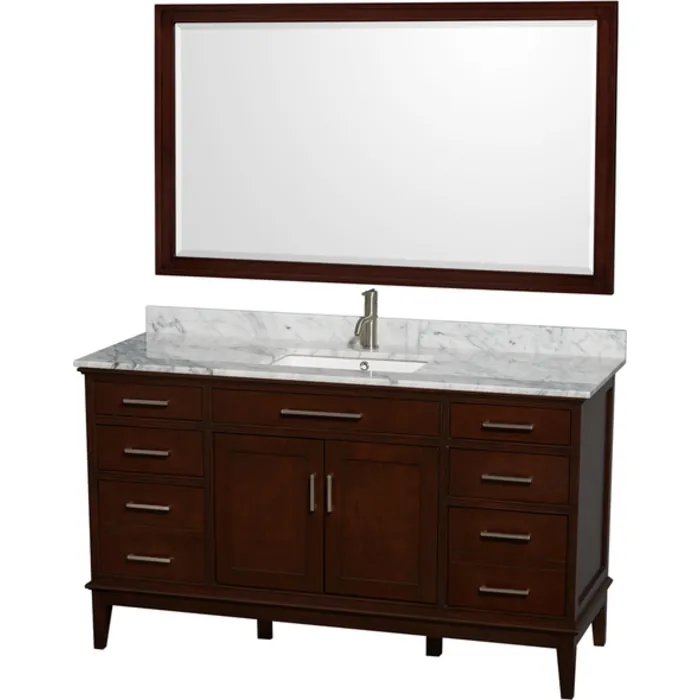 Wyndham Collection WCV161660SCDCMUNSM56 60 In. Single Bathroom Vanity In Dark Chestnut, White Carrera Marble Countertop, Undermount Square Sink, And 56 In. Mirror