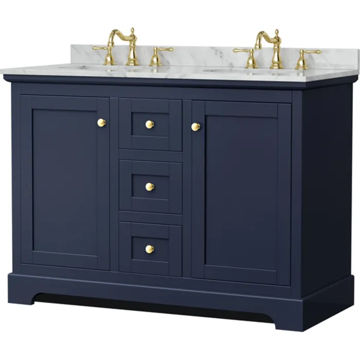 Avery 48 Inch Double Bathroom Vanity in Dark Blue, White Carrara Marble Countertop, Undermount Oval Sinks, No Mirror
