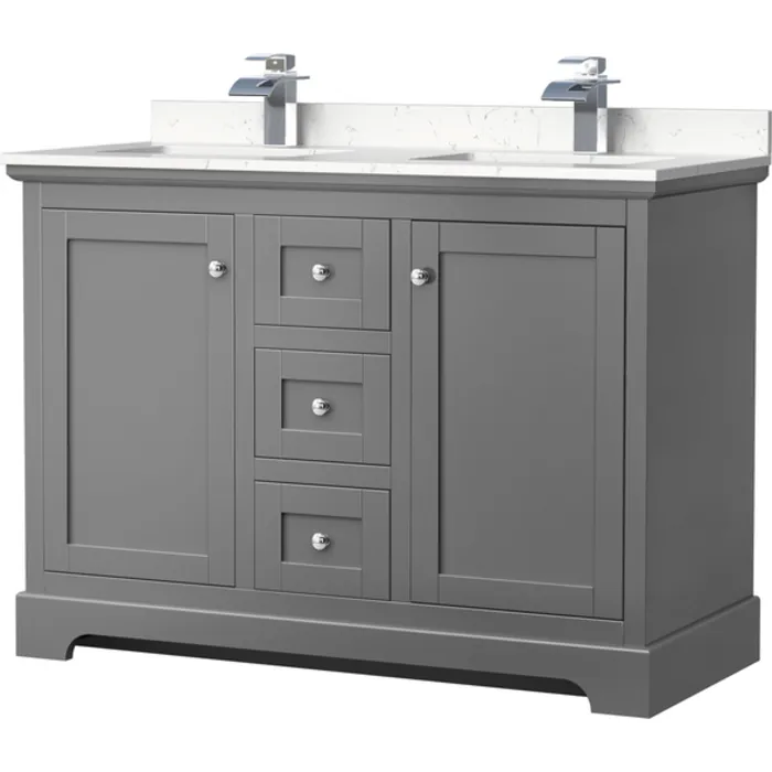 Avery 48 Inch Double Bathroom Vanity in Dark Gray, Light-Vein Carrara Cultured Marble Countertop, Undermount Square Sinks, No Mirror