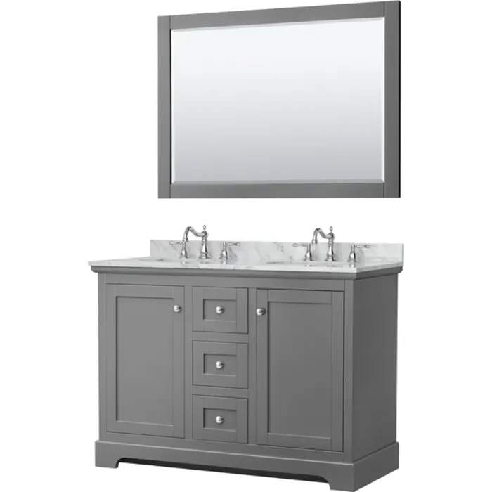 Avery 48 Inch Double Bathroom Vanity in Dark Gray, White Carrara Marble Countertop, Undermount Oval Sinks, 46 Inch Mirror