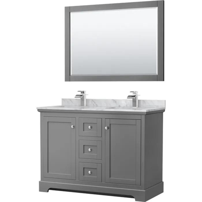 Avery 48 Inch Double Bathroom Vanity in Dark Gray, White Carrara Marble Countertop, Undermount Square Sinks, 46 Inch Mirror