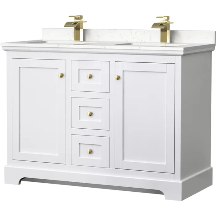Avery 48 Inch Double Bathroom Vanity in White, Light-Vein Carrara Cultured Marble Countertop, Undermount Square Sinks, Brushed Gold Trim