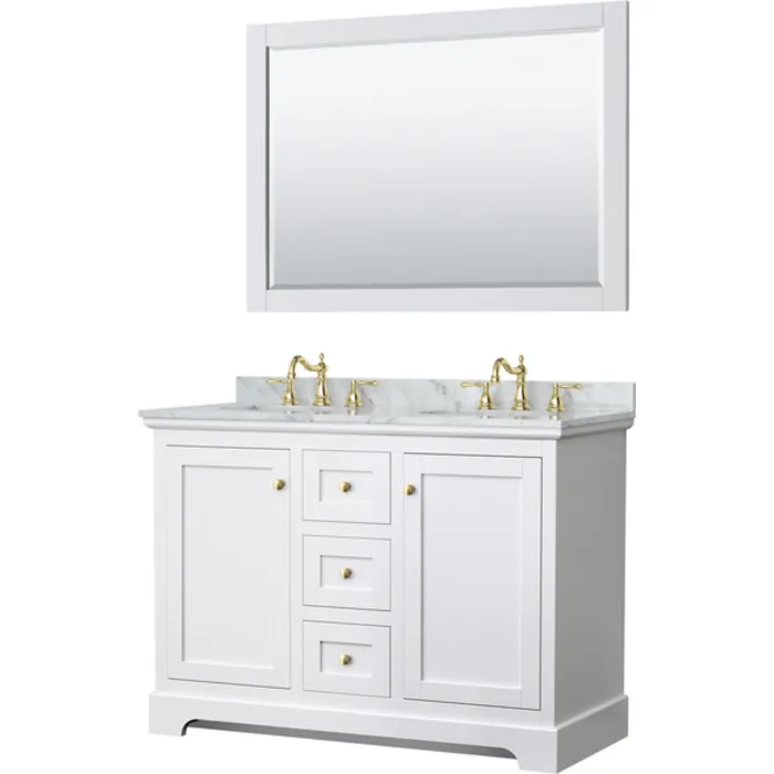 Avery 48 Inch Double Bathroom Vanity in White, White Carrara Marble Countertop, Undermount Oval Sinks, 46 Inch Mirror, Brushed Gold Trim