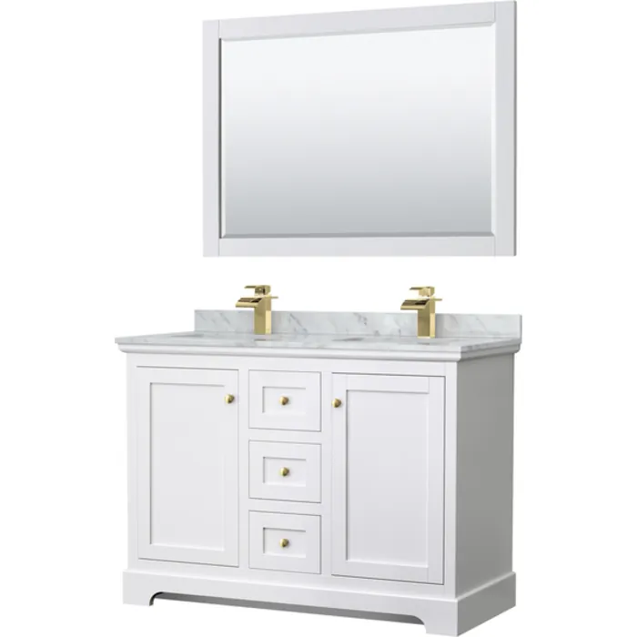 Avery 48 Inch Double Bathroom Vanity in White, White Carrara Marble Countertop, Undermount Square Sinks, 46 Inch Mirror, Brushed Gold Trim