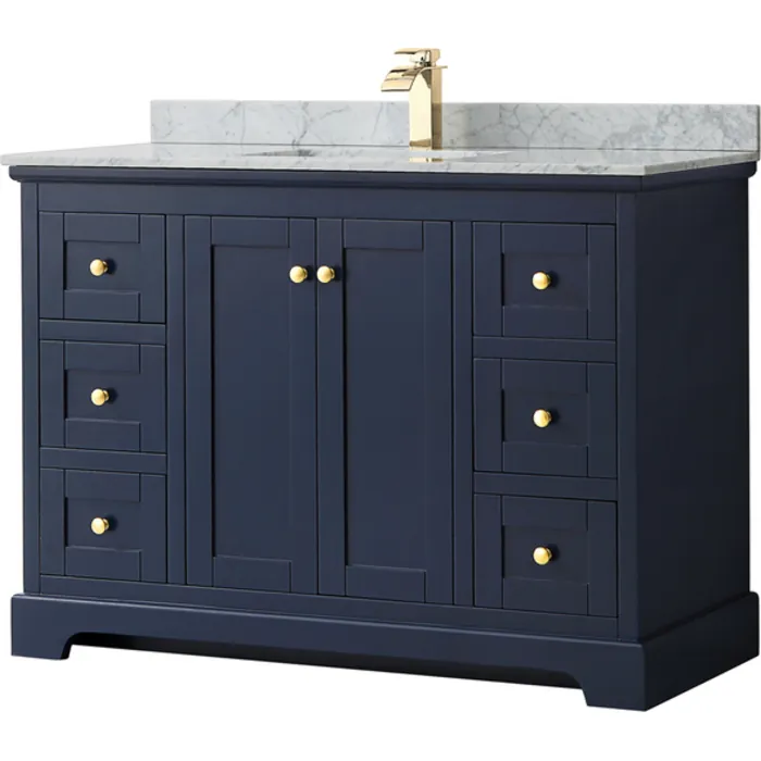 Avery 48 Inch Single Bathroom Vanity in Dark Blue, White Carrara Marble Countertop, Undermount Square Sink, and No Mirror