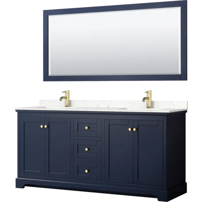 Avery 72 Inch Double Bathroom Vanity in Dark Blue, Light-Vein Carrara Cultured Marble Countertop, Undermount Square Sinks, 70 Inch Mirror