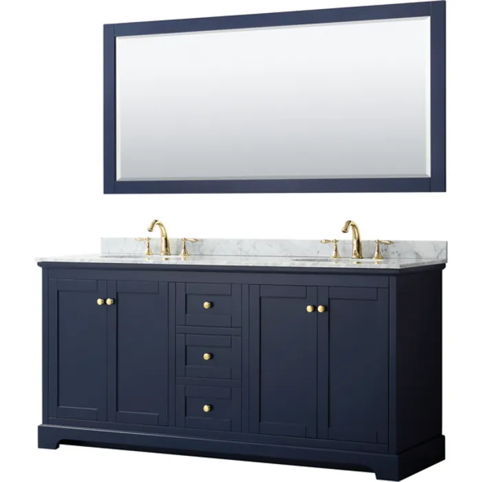 Avery 72 Inch Double Bathroom Vanity in Dark Blue, White Carrara Marble Countertop, Undermount Oval Sinks, and 70 Inch Mirror