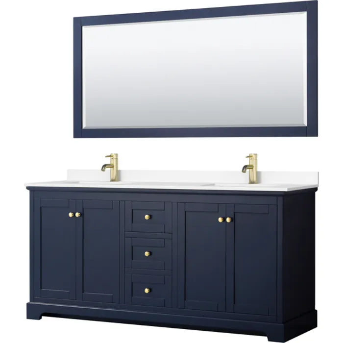 Avery 72 Inch Double Bathroom Vanity in Dark Blue, White Cultured Marble Countertop, Undermount Square Sinks, 70 Inch Mirror