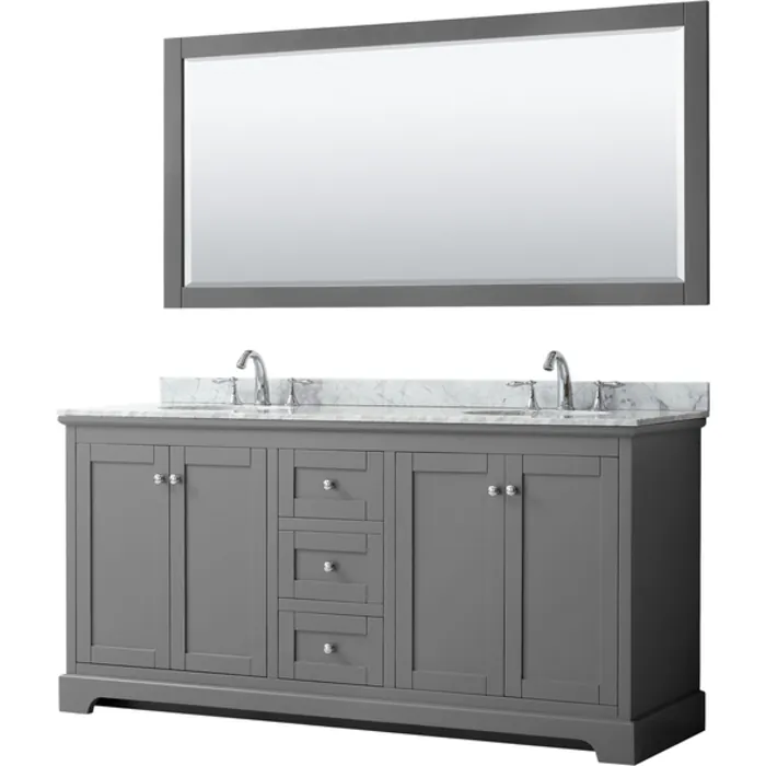 Avery 72 Inch Double Bathroom Vanity in Dark Gray, White Carrara Marble Countertop, Undermount Oval Sinks, and 70 Inch Mirror