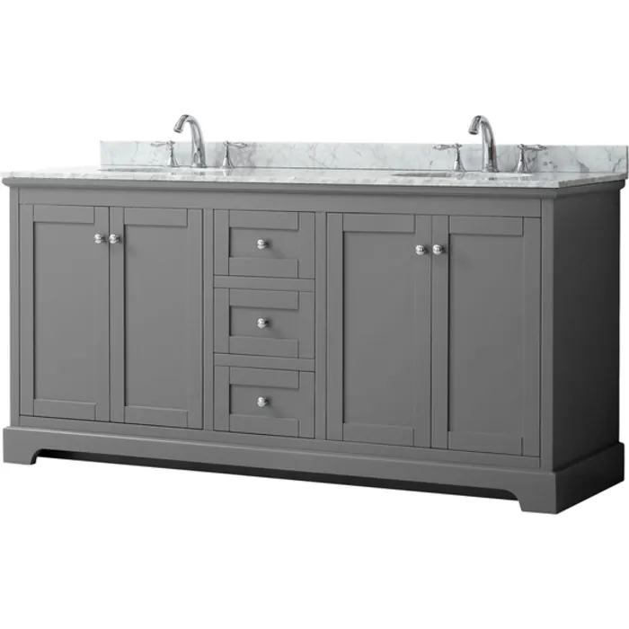 Avery 72 Inch Double Bathroom Vanity in Dark Gray, White Carrara Marble Countertop, Undermount Oval Sinks, and No Mirror