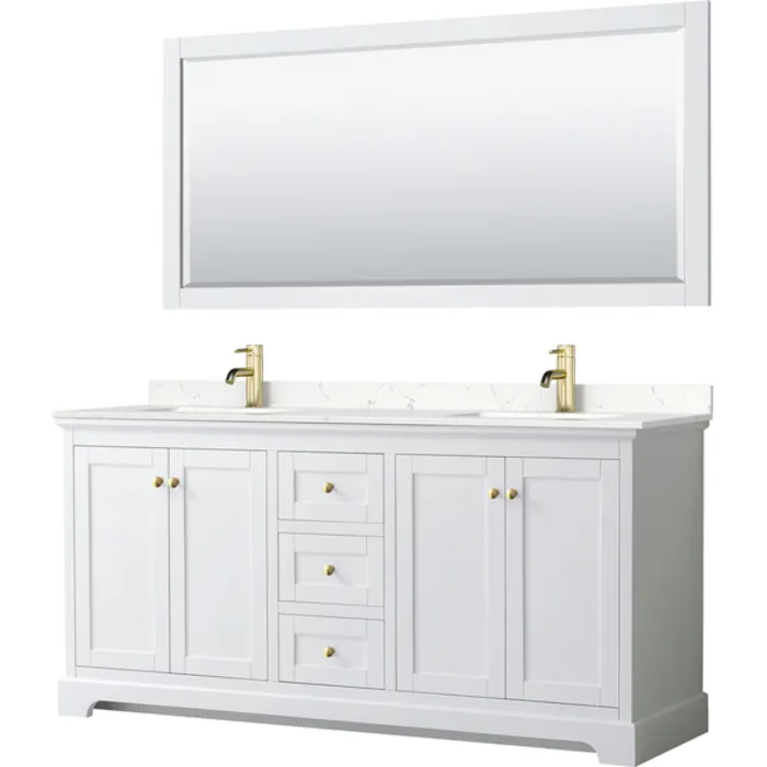 Avery 72 Inch Double Bathroom Vanity in White, Light-Vein Carrara Cultured Marble Countertop, Undermount Square Sinks, 70 Inch Mirror, Brushed Gold Trim