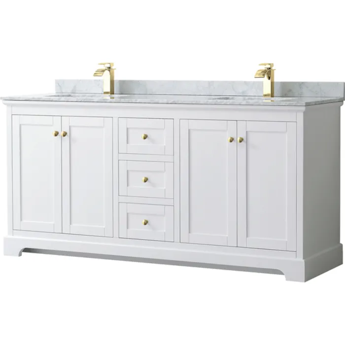 Avery 72 Inch Double Bathroom Vanity in White, White Carrara Marble Countertop, Undermount Square Sinks, Brushed Gold Trim