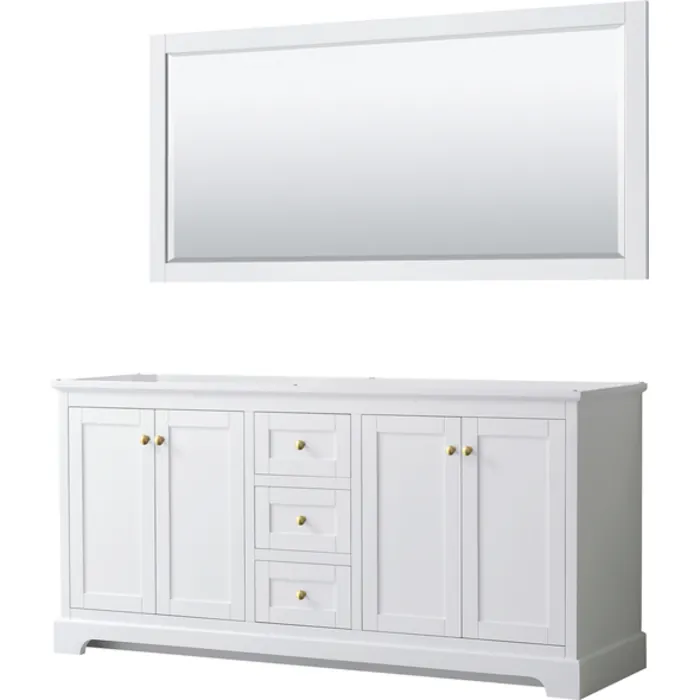Avery 72 Inch Double Bathroom Vanity in White, No Countertop, No Sinks, 70 Inch Mirror, Brushed Gold Trim