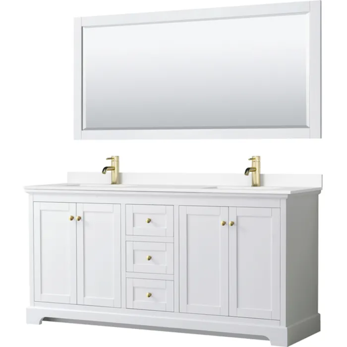 Avery 72 Inch Double Bathroom Vanity in White, White Cultured Marble Countertop, Undermount Square Sinks, 70 Inch Mirror, Brushed Gold Trim