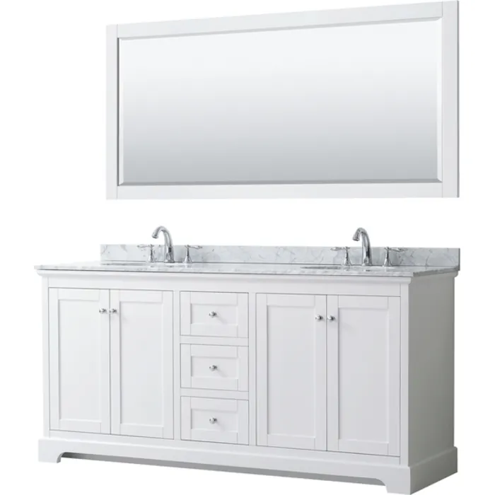 Avery 72 Inch Double Bathroom Vanity in White, White Carrara Marble Countertop, Undermount Oval Sinks, and 70 Inch Mirror