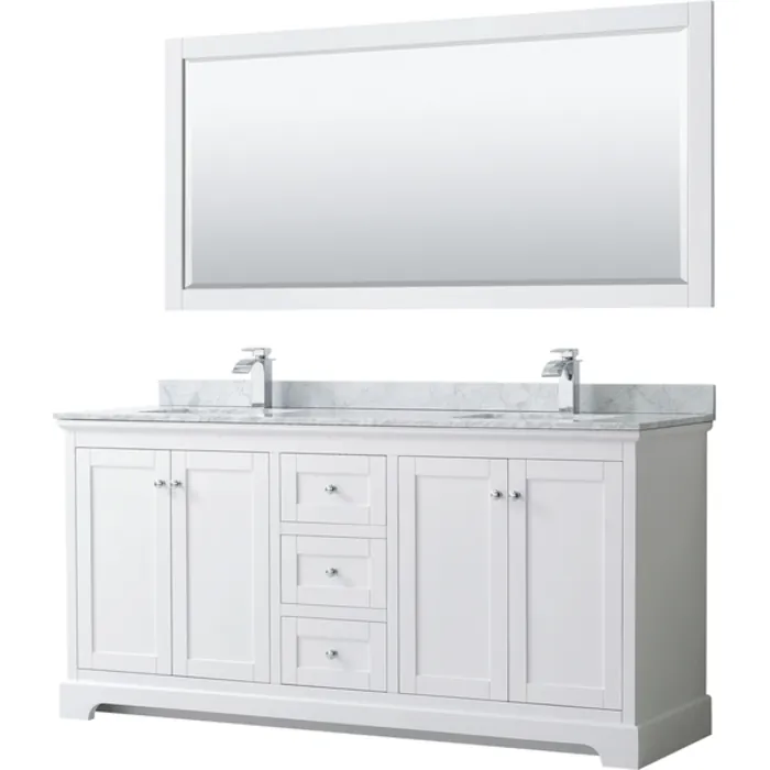 Avery 72 Inch Double Bathroom Vanity in White, White Carrara Marble Countertop, Undermount Square Sinks, and 70 Inch Mirror
