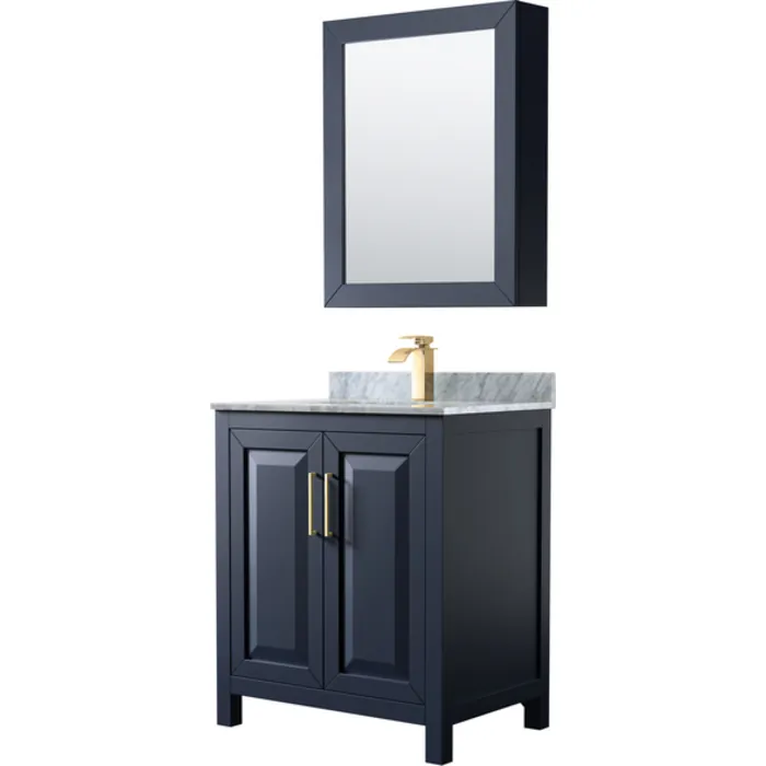 Daria 30 Inch Single Bathroom Vanity in Dark Blue, White Carrara Marble Countertop, Undermount Square Sink, Medicine Cabinet