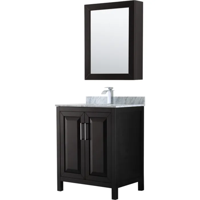 Wyndham Collection 30 Inch Single Bathroom Vanity In Dark Espresso, White Carrara Marble Countertop, Undermount Square Sink, And Medicine Cabinet WCV252530SDECMUNSMED