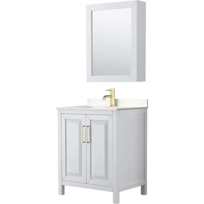 Daria 30 Inch Single Bathroom Vanity in White, Light-Vein Carrara Cultured Marble Countertop, Undermount Square Sink, Medicine Cabinet, Brushed Gold Trim