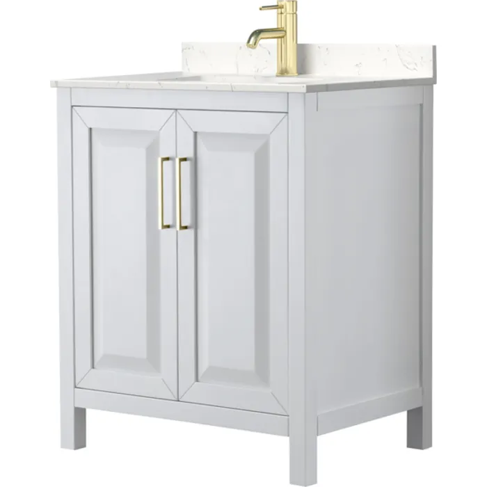Daria 30 Inch Single Bathroom Vanity in White, Light-Vein Carrara Cultured Marble Countertop, Undermount Square Sink, Brushed Gold Trim