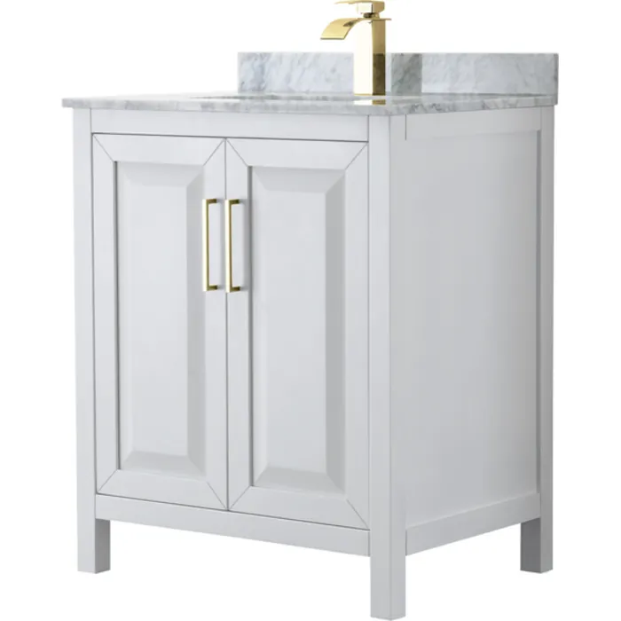 Daria 30 Inch Single Bathroom Vanity in White, White Carrara Marble Countertop, Undermount Square Sink, Brushed Gold Trim