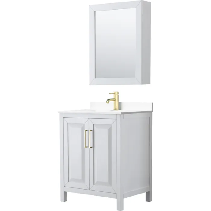 Daria 30 Inch Single Bathroom Vanity in White, White Cultured Marble Countertop, Undermount Square Sink, Medicine Cabinet, Brushed Gold Trim